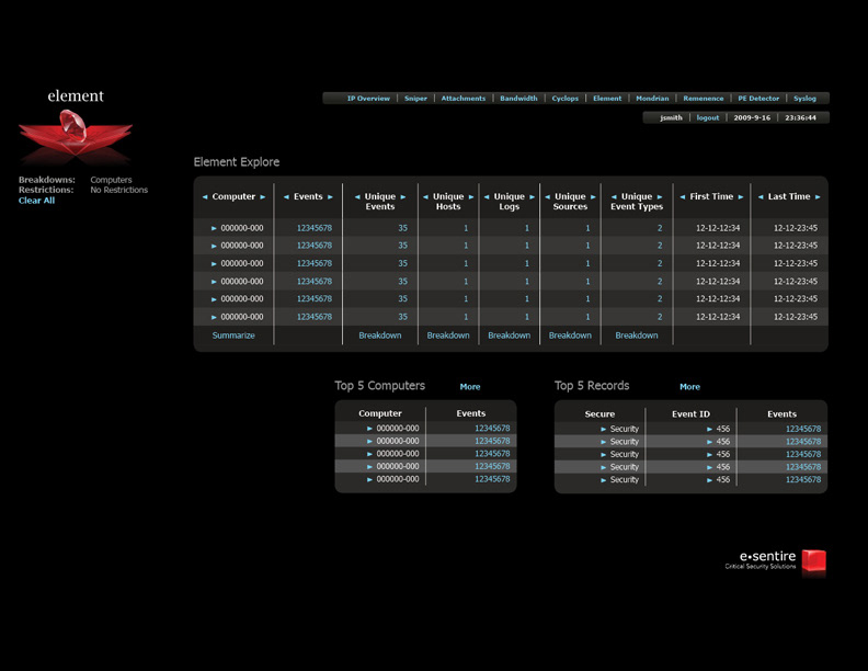 Logo and software interface design for e-sentire, a network security company.